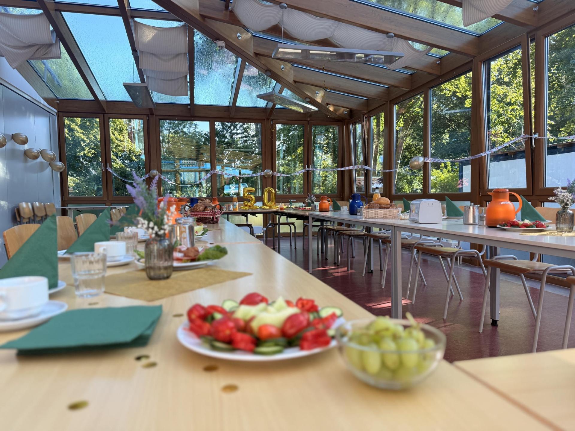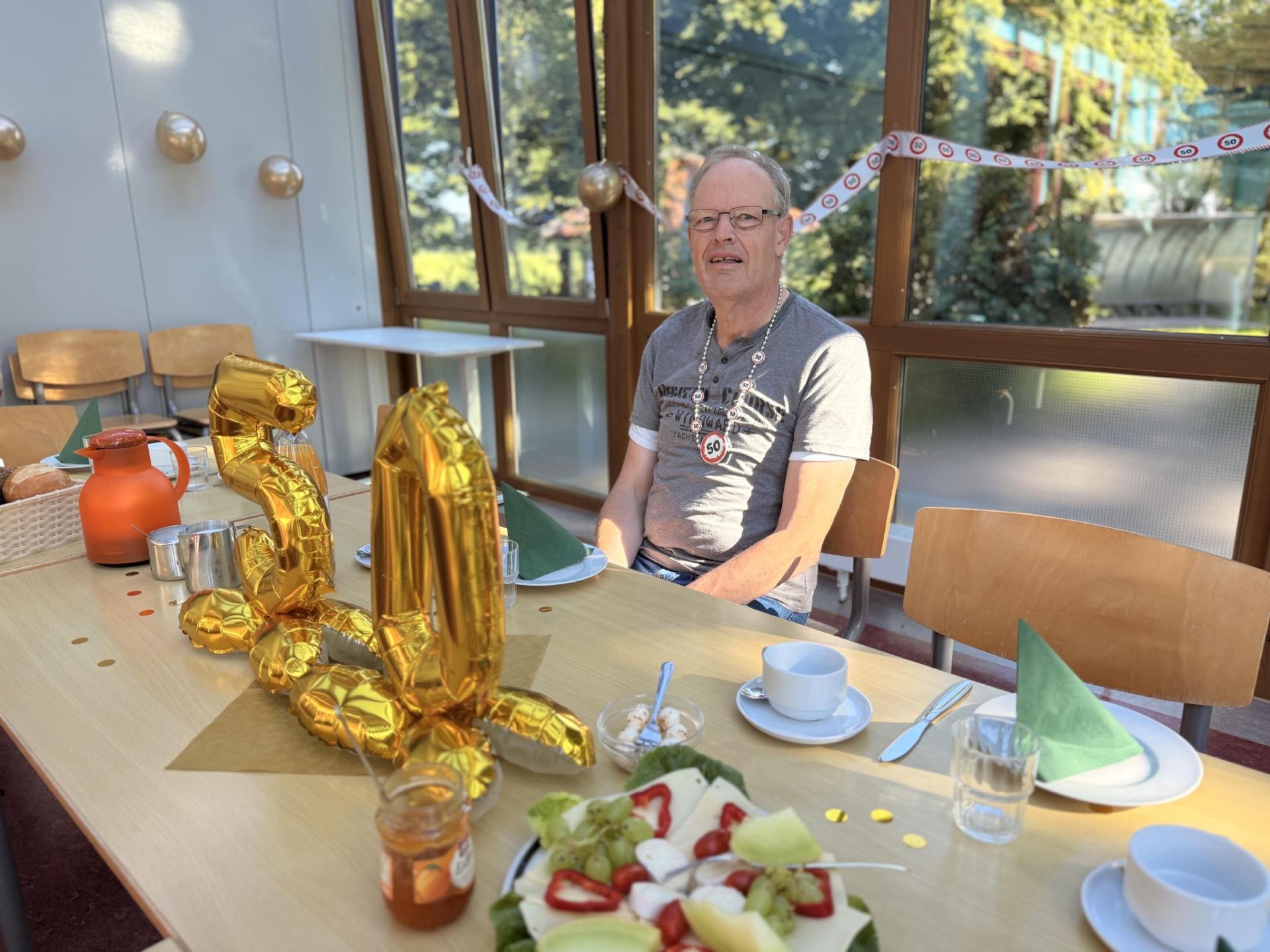 Gefrühstückt wurde im festlich geschmückten Speisesaal der Werkstatt. Überall hingen Girlanden, Walters Arbeitsplatz war liebevoll dekoriert, und an seinem Spind prangten glänzende Jubiläums-Aufkleber. Um den Hals trug er eine große „50“-Kette, die seinen besonderen Tag noch einmal unterstrich. Es wurde gelacht, in Erinnerungen geschwelgt und auf viele gemeinsame Jahre zurückgeblickt.