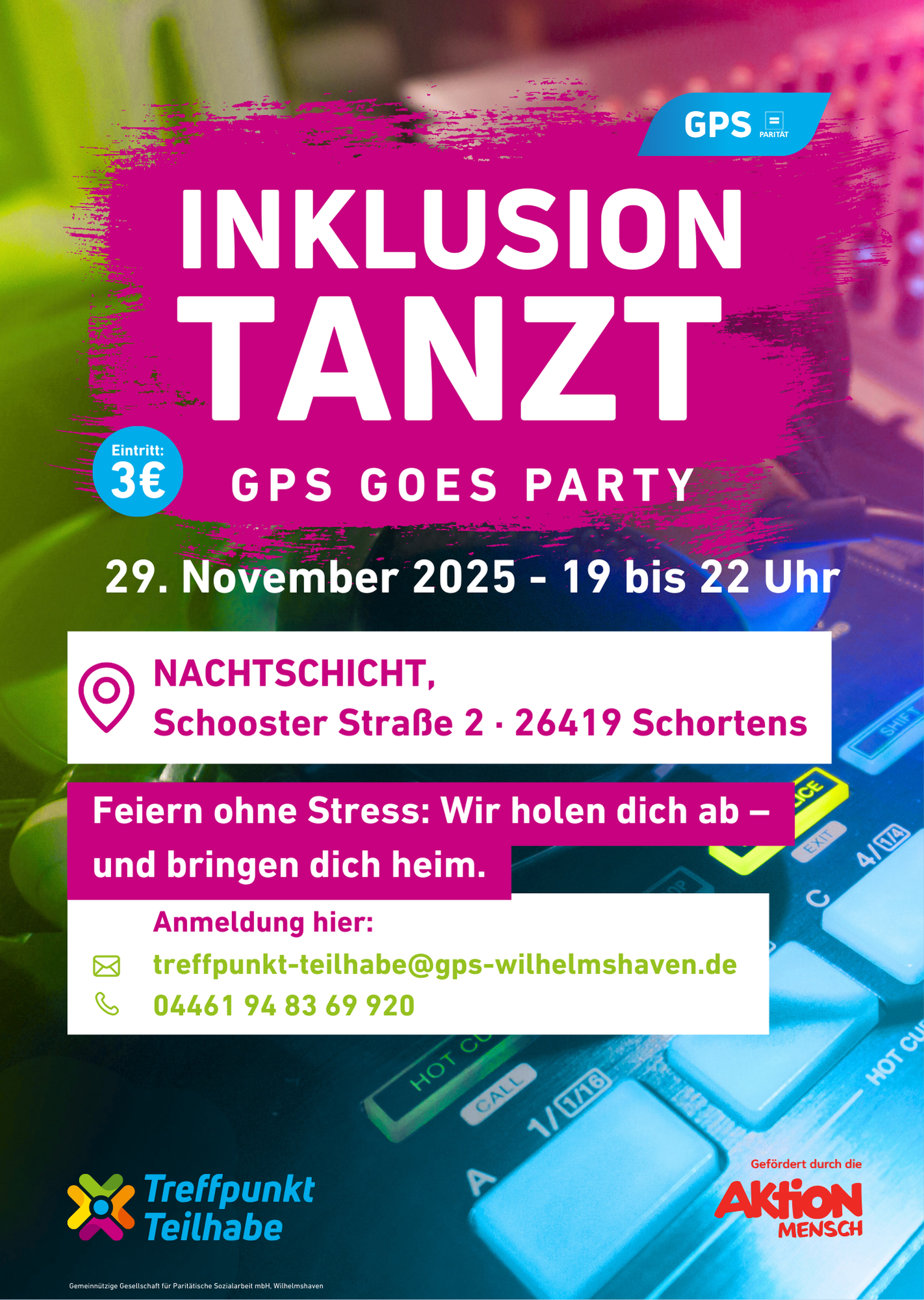 Am 29.11.2025 in der Nachtschicht Schortens um 19-22 Uhr steigt die zweite Party im Rahmen von „Inklusion tanzt – GPS goes Party“ im Jahr 2025. Für nur drei Euro Eintritt könnt ihr drei Stunden voller Musik und Spaß erleben.