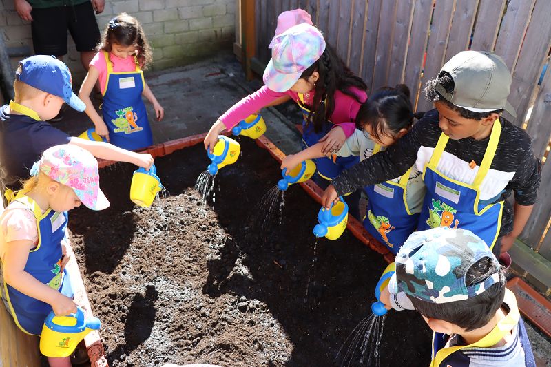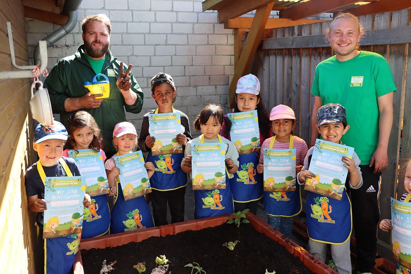 Mit Hilfe von Schürzen und Gieskannen haben die neun Kinder gemeinsam mit dem Team der Stiftung verschiedene Gemüsesorten gepflanzt. Von Gurken über Salat bis zu Paprika findet sich nun ein buntes Angebot in dem Hochbeet der Gruppe. Die Kinder lernen so auf spielerische Weise, wie viel Aufmerksamkeit die Setzlinge benötigen, bis sie geerntet und zu Speisen verarbeitet werden können. Dazu säen und pflegen die Kinder ihr eigenes Gemüse, das ebenfalls von der Stiftung kostenlos zur Verfügung gestellt worden ist. Am Ende der Pflanzaktion erhielten dann alle Kinder eine Urkunde als „Mini-Gärtner“.