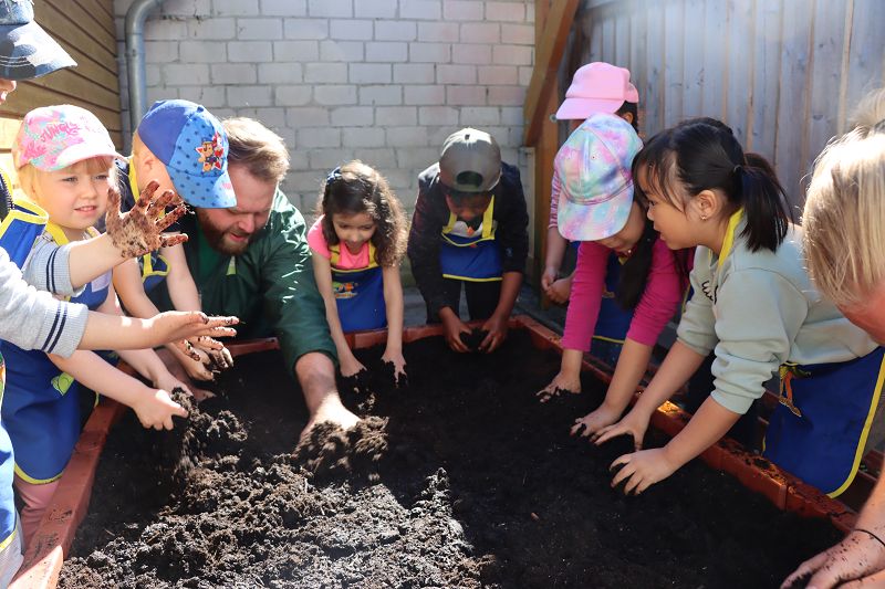 Ein Mann (Gärtner) mit acht kleinen Kindern stehen vor einem Beet mit Sand. Sie halten alle ihre schmutzigen Hände hoch.
