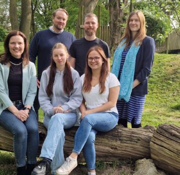 GPS Gerhard Haack Preis Nominierte sind draußen auf einem Hof und halten Ihre Urkunde in den Händen. Sie lächeln. Man sieht auch neben der Gruppe eine GPS Gerhard Haack Preis Flagge.