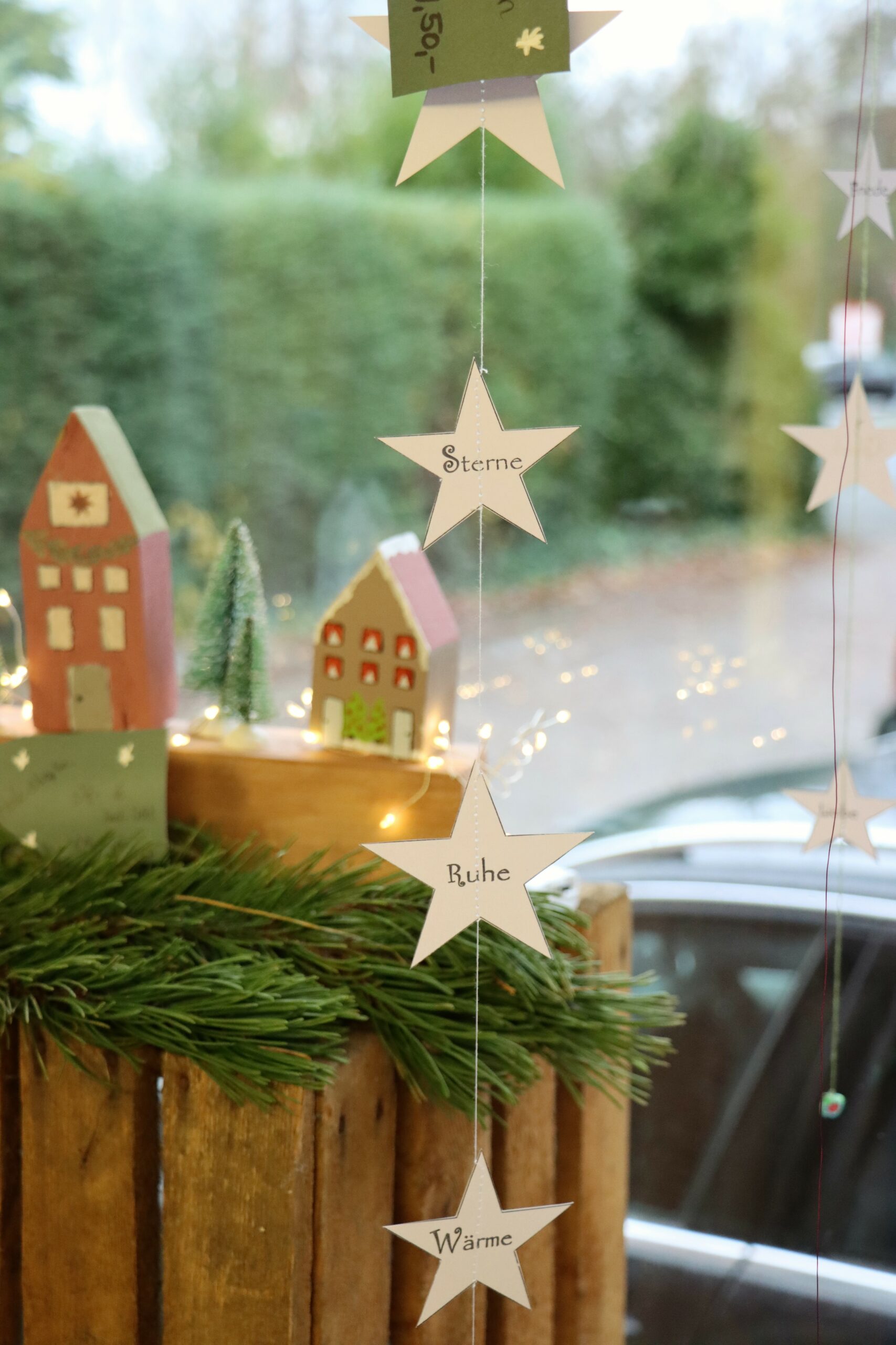 Bunte gebastelte Häuschen und ein Tannenbaum
