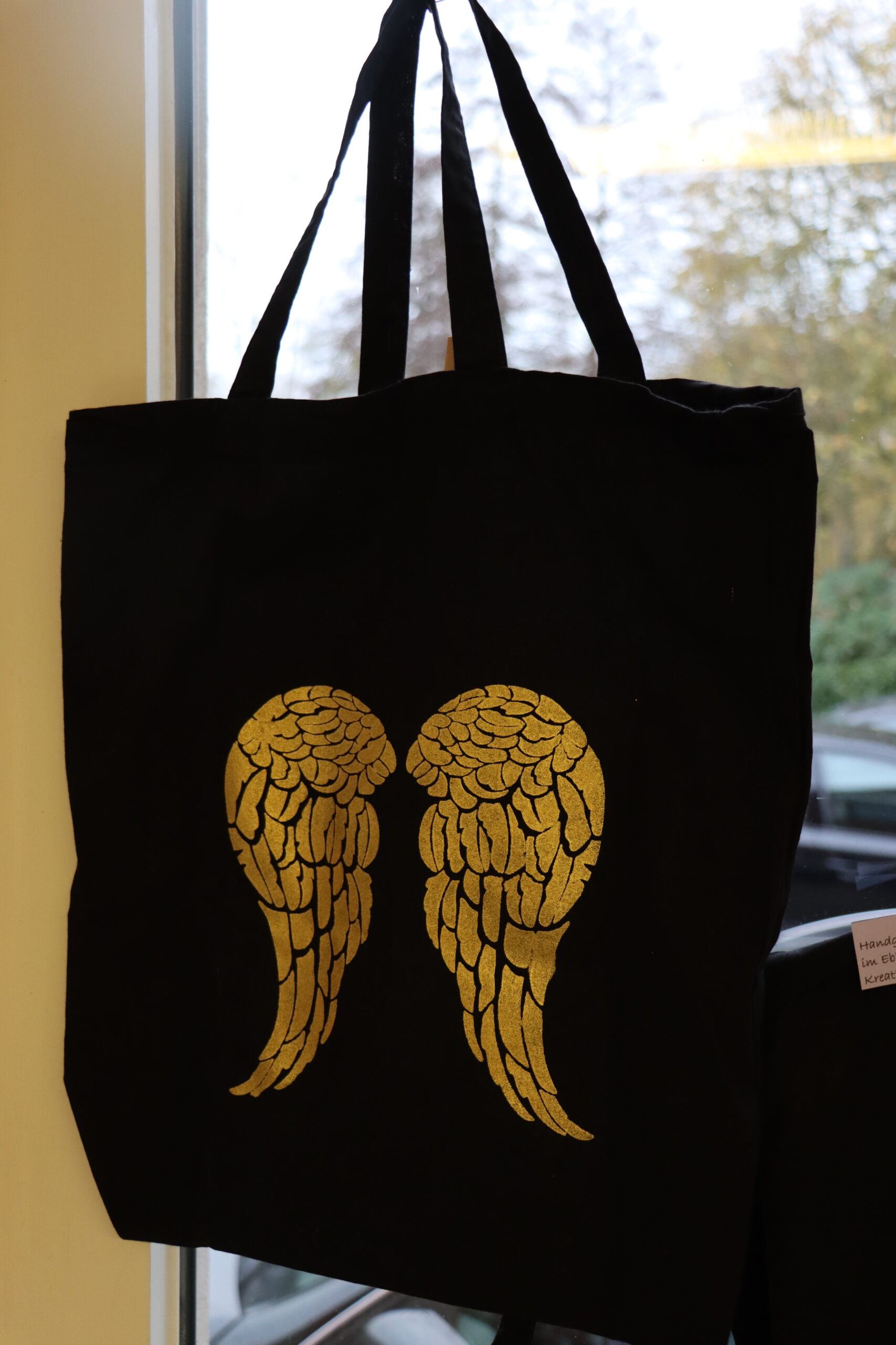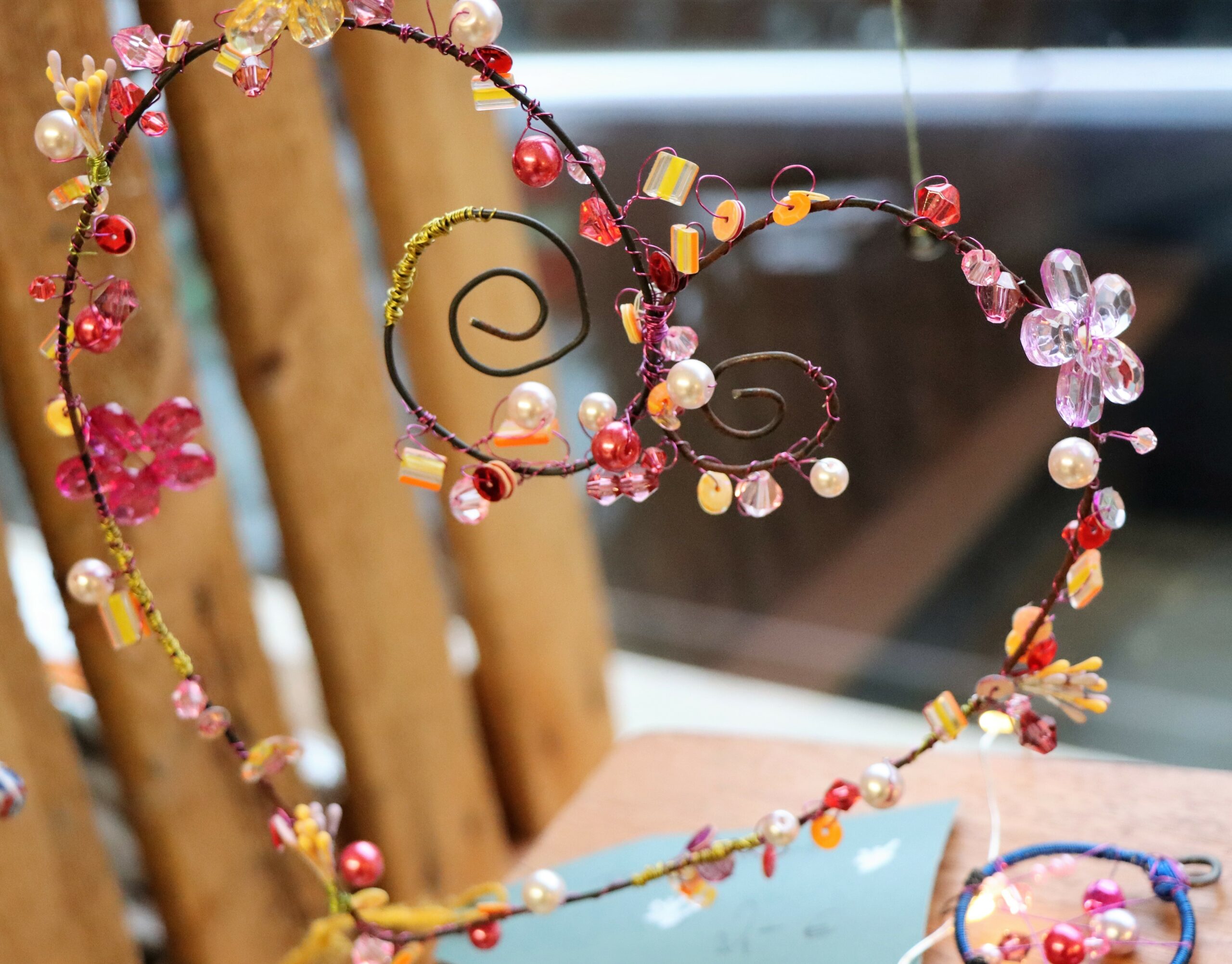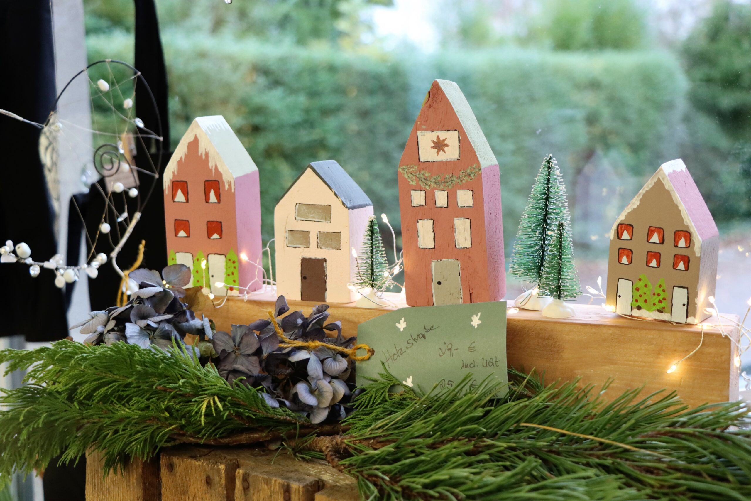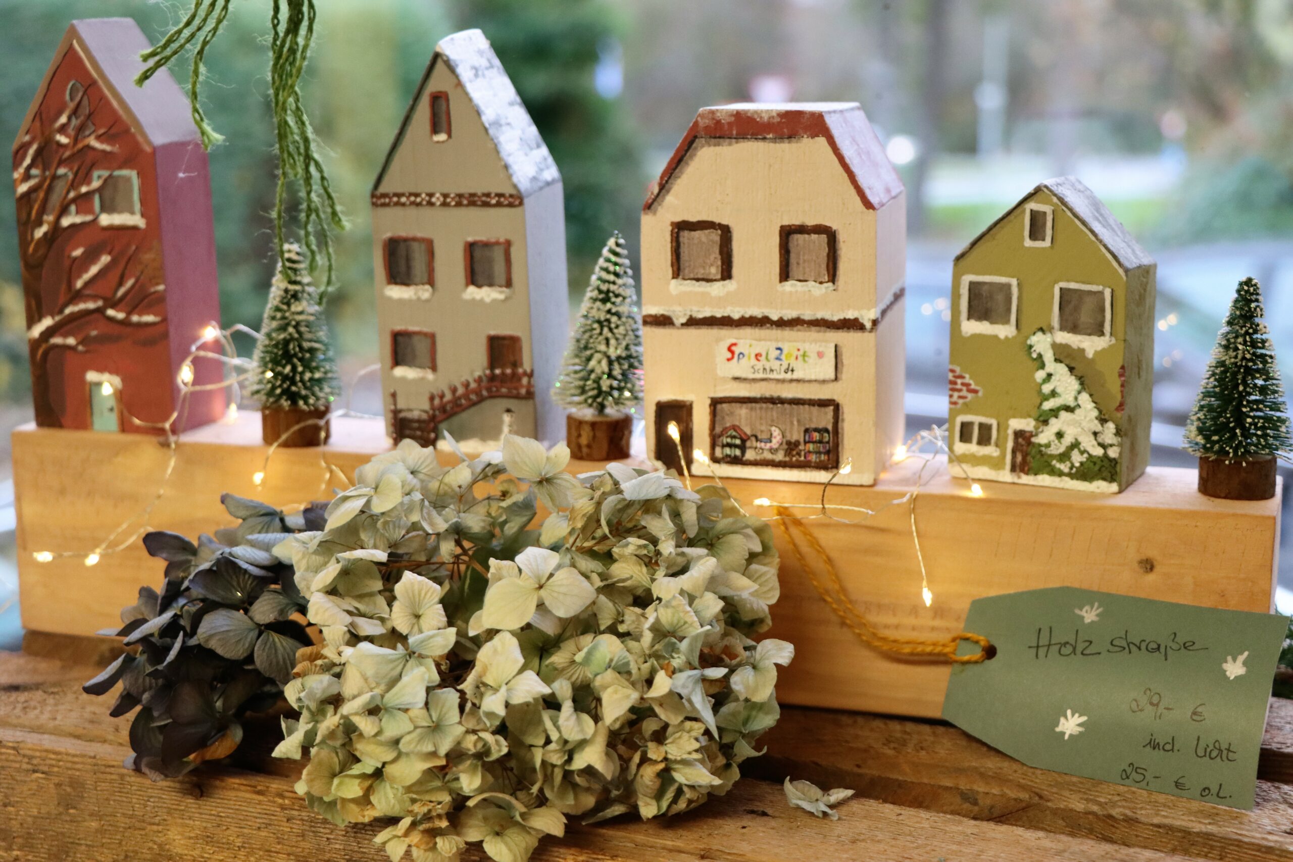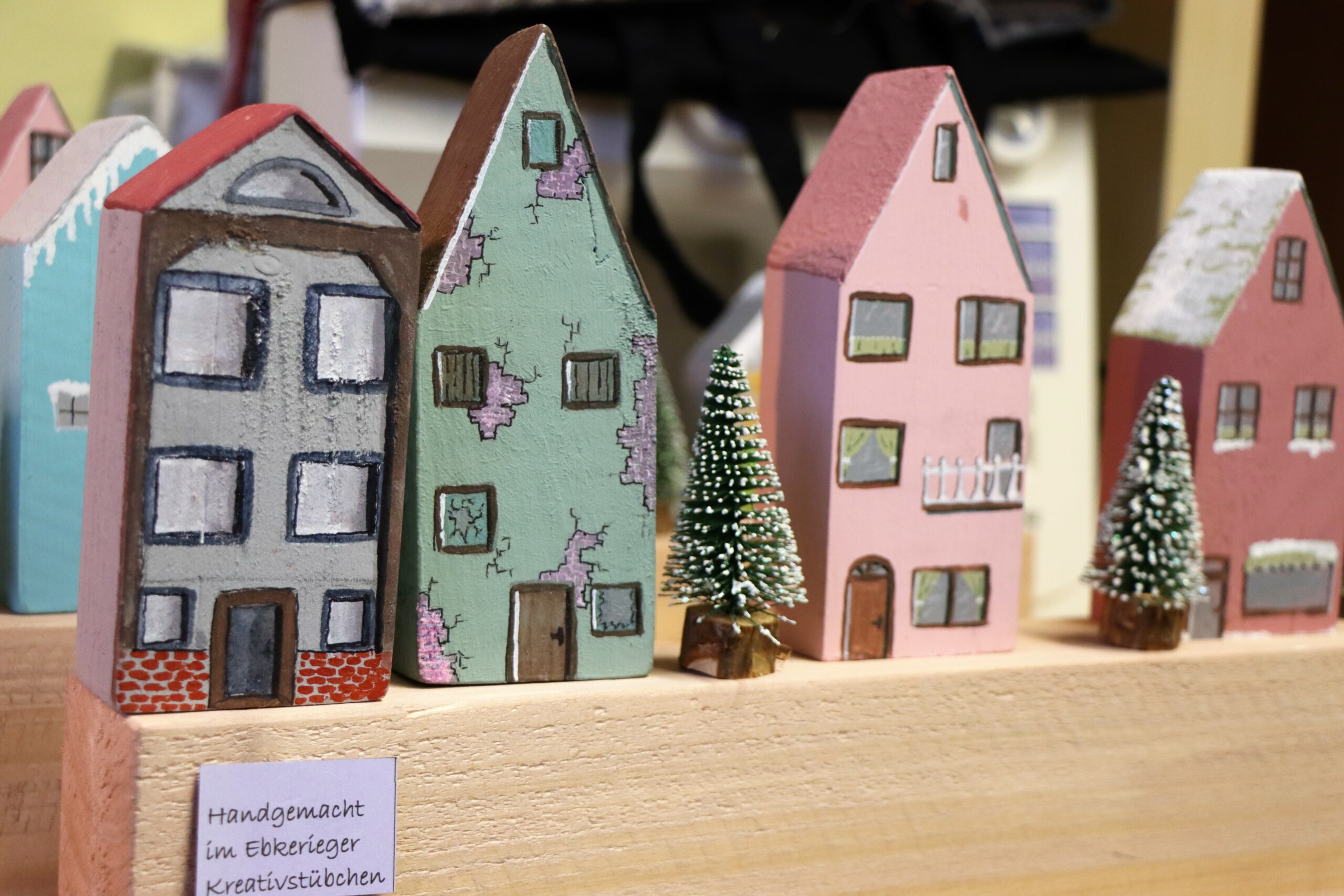 Von Taschen über Wortketten, Abschminkpads, Windlichtern aus Makramee oder Geschenkanhängern in Form von Engelsflügeln – hier gibt es jede Menge zu entdecken. Ein besonderes Highlight sind die Holzstraßen aus kleinen bemalten Häusern, die nebeneinander aufgereiht sind. Zwei Monate lang wurde in der Tagesstätte Ebkeriege dafür fleißig gesägt, geschmirgelt und gemalt.