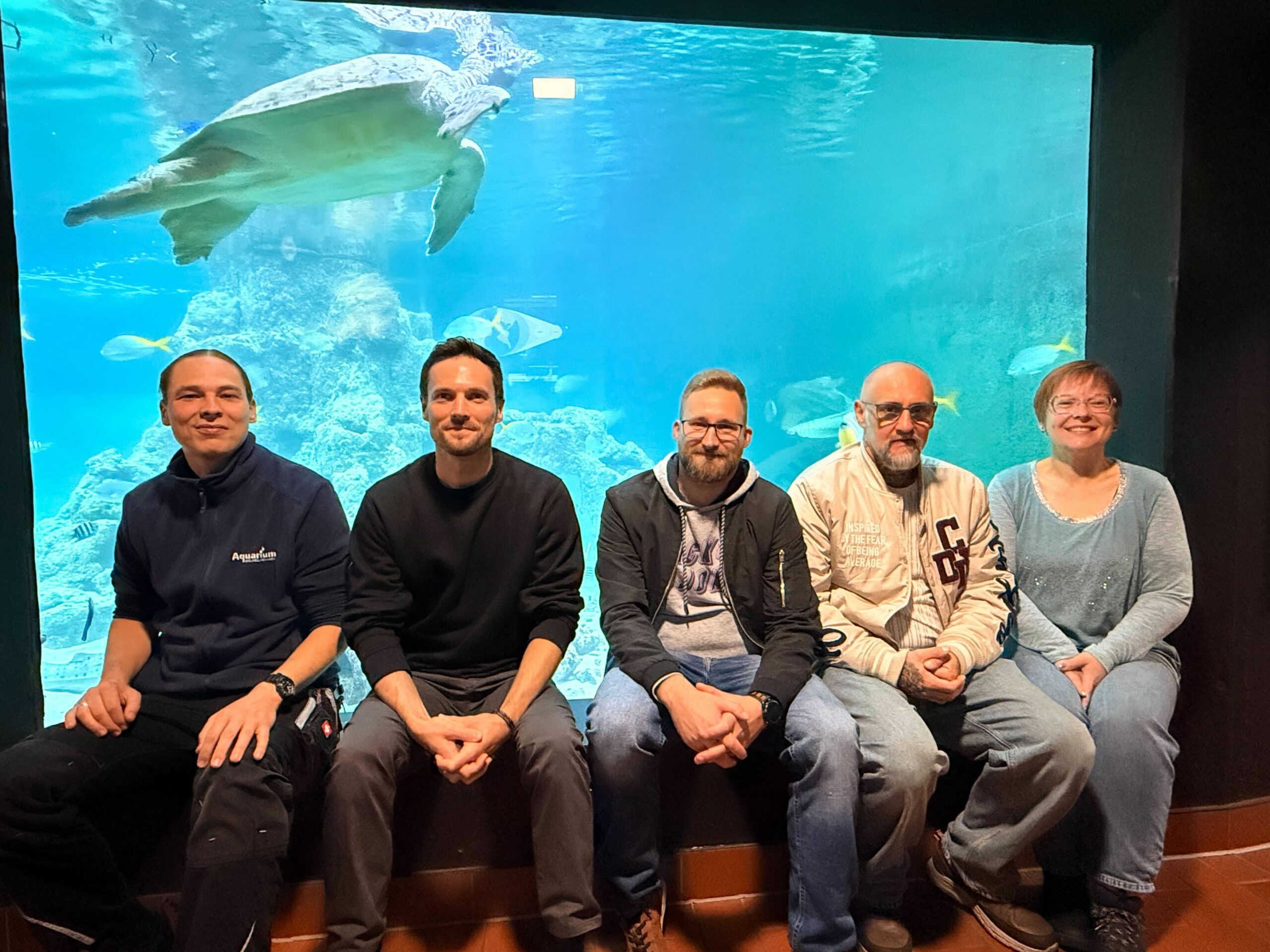 Wenige Tage später konnte die ARTEC-Gruppe selbst sehen, wofür sie gearbeitet hatte. Im Aquarium schwamm Ernie entspannt durch sein neues Becken, präsentierte sich neugierig und schien bereits bestens eingelebt. Dreimal am Tag bekommt er Salat und grünes Gemüse – rund zwei Kilo täglich, gefüttert mit einer langen Zange. Fische, die er bereits aus seinem früheren Zuhause kennt, leisten ihm Gesellschaft.