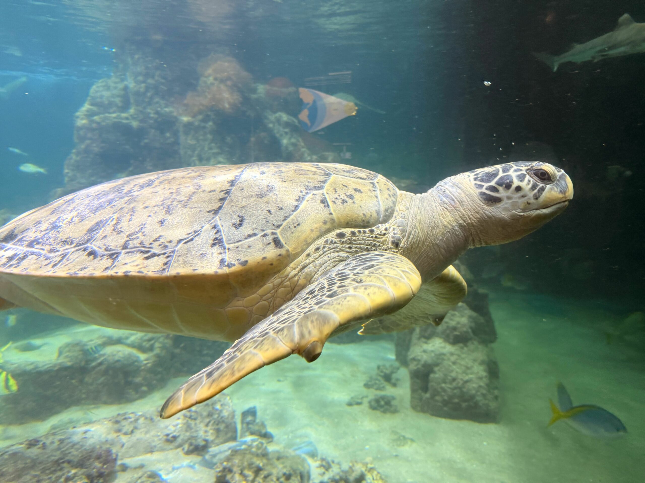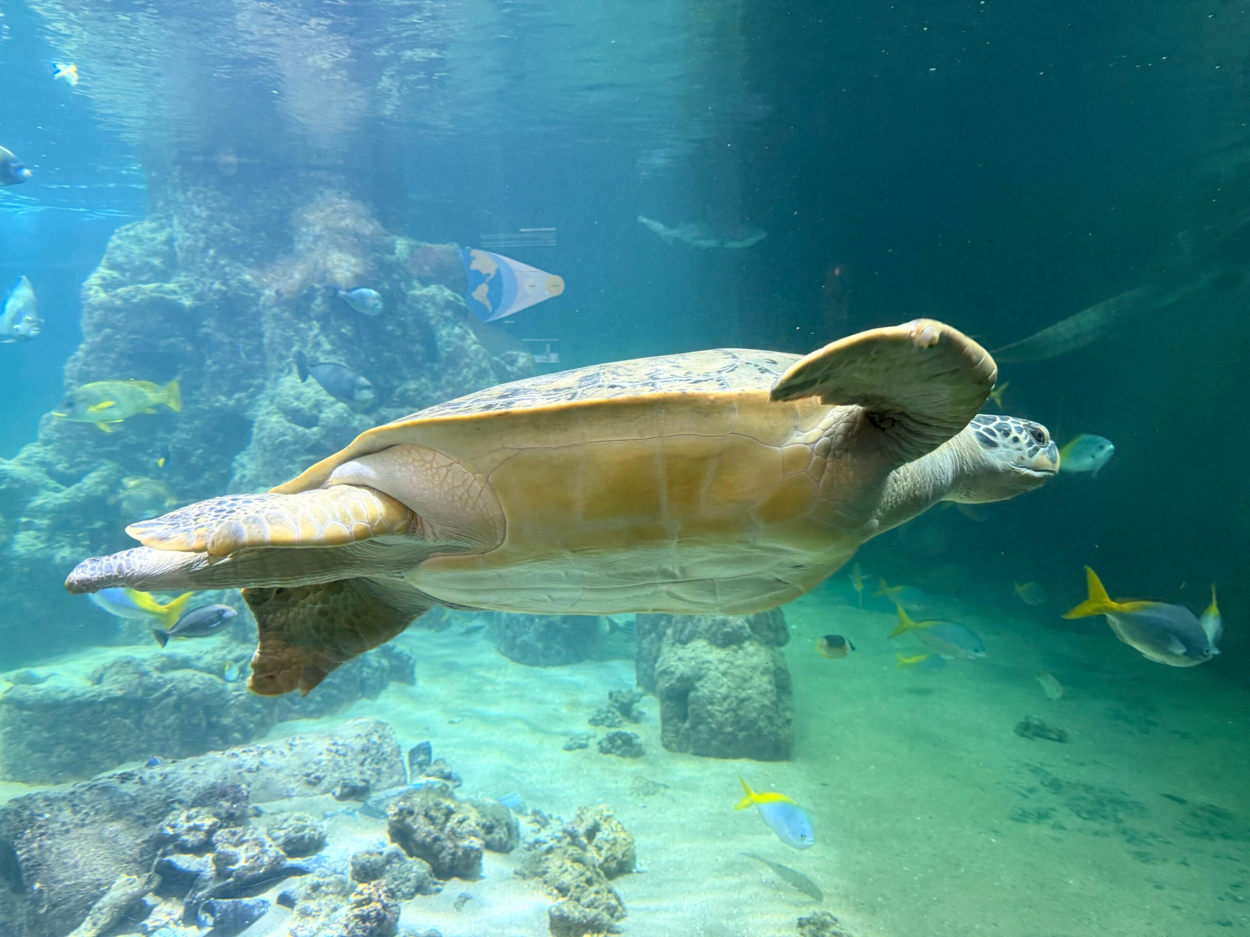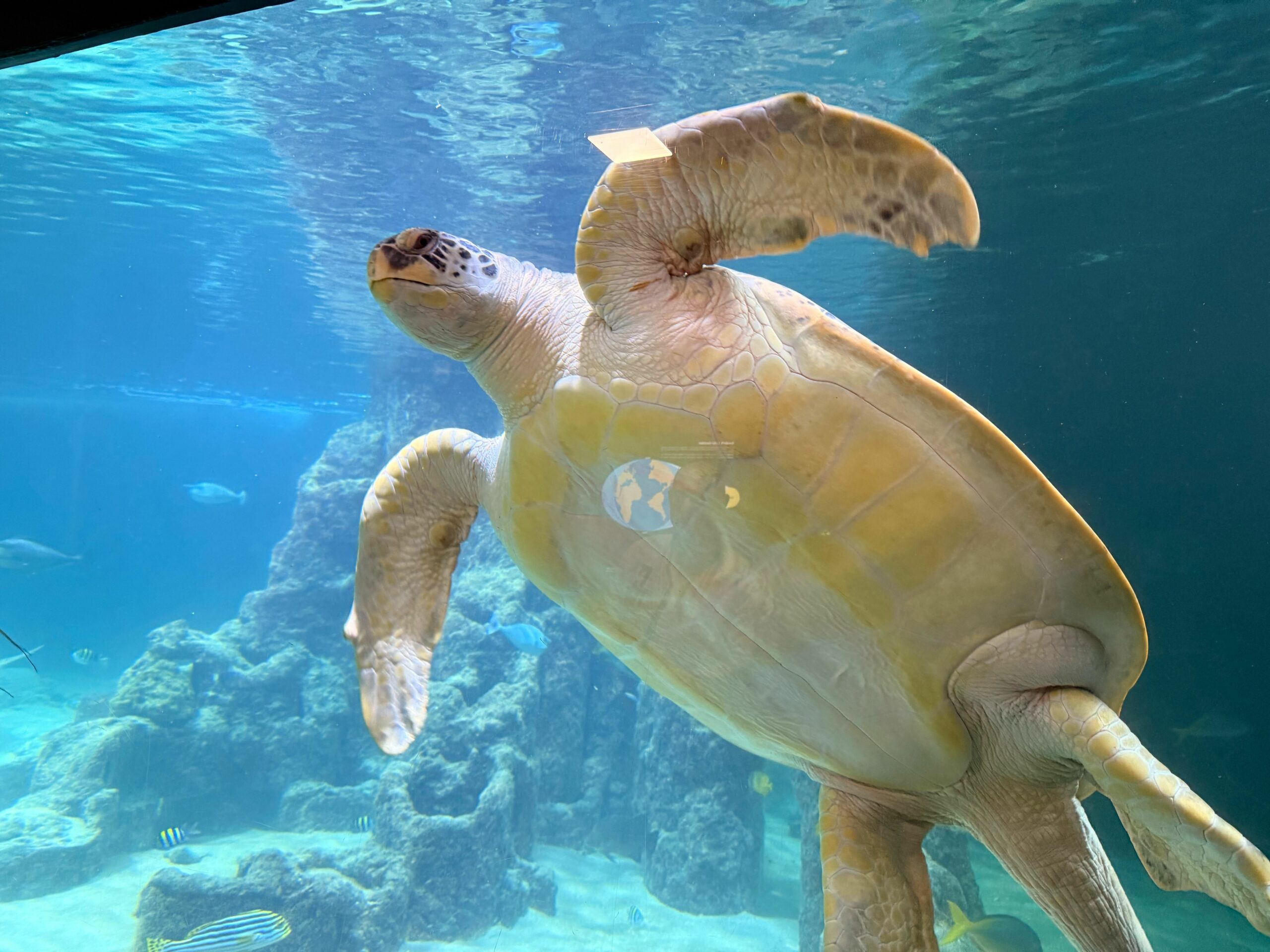 Ernie kam aus dem niederländischen Scheveningen, wo sein Lebensraum saniert wird. Für das Aquarium ist er eine Attraktion – und gleichzeitig eine Verantwortung. Grüne Meeresschildkröten sind stark gefährdet. Mit einer Panzerlänge von einem Meter und der Möglichkeit, noch bis zu 1,50 Meter zu wachsen, ist Ernie ein echter Meeresriese.