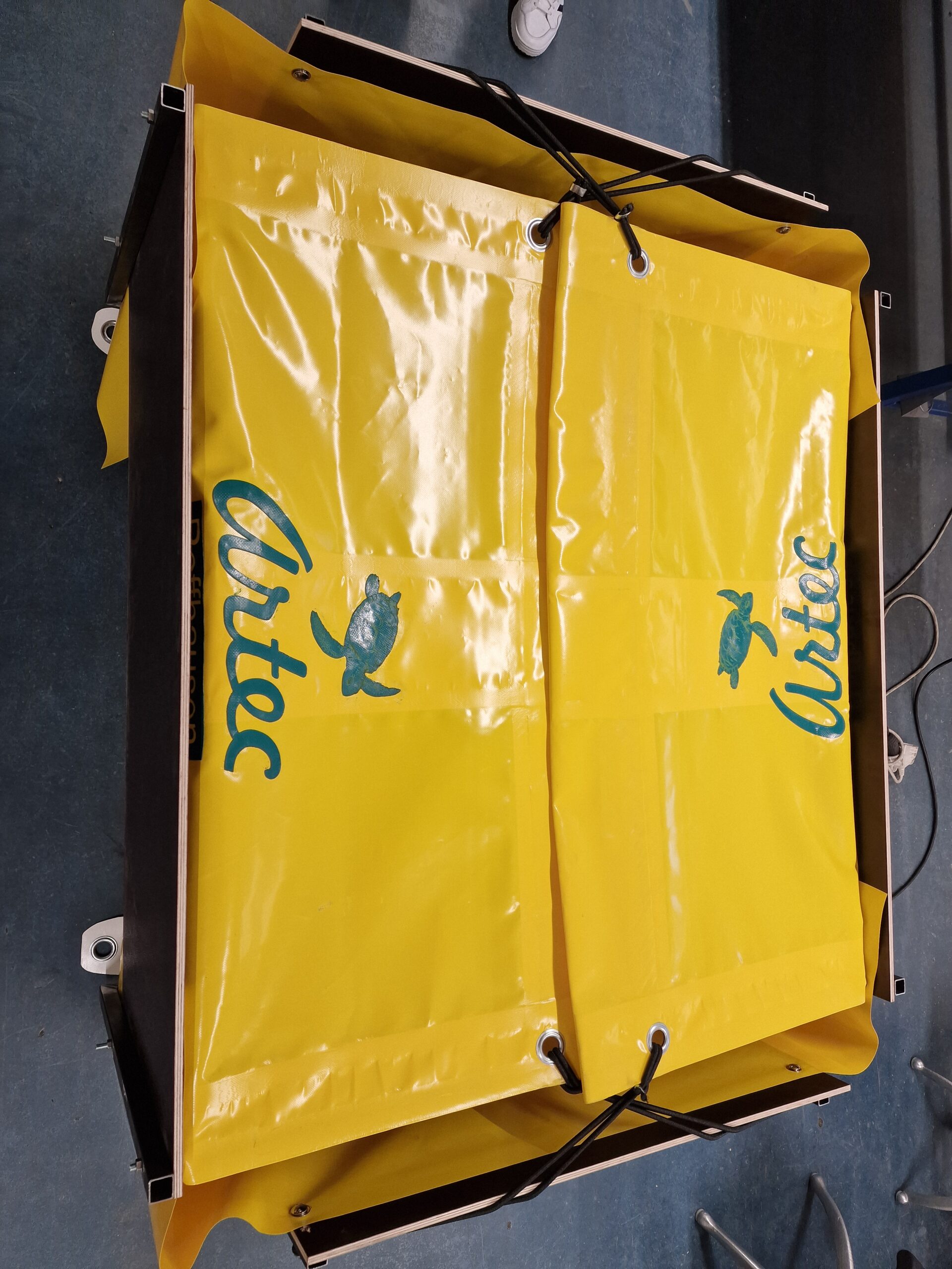 So entstand in sorgfältiger Handarbeit eine Transportkiste mit Luftlöchern, passgenauen Seitenwänden und flexibler Konstruktion – anpassbar, falls Ernie noch wachsen sollte und später vielleicht doch noch einmal reisen muss. Am 5. September machte er sich dann auf den Weg nach Wilhelmshaven. Während des Transports wurde er regelmäßig mit Salzwasser besprüht, seine Augen mit Tropfen befeuchtet. Sicher verstaut in der ARTEC-Kiste kam er wohlbehalten im Aquarium an.